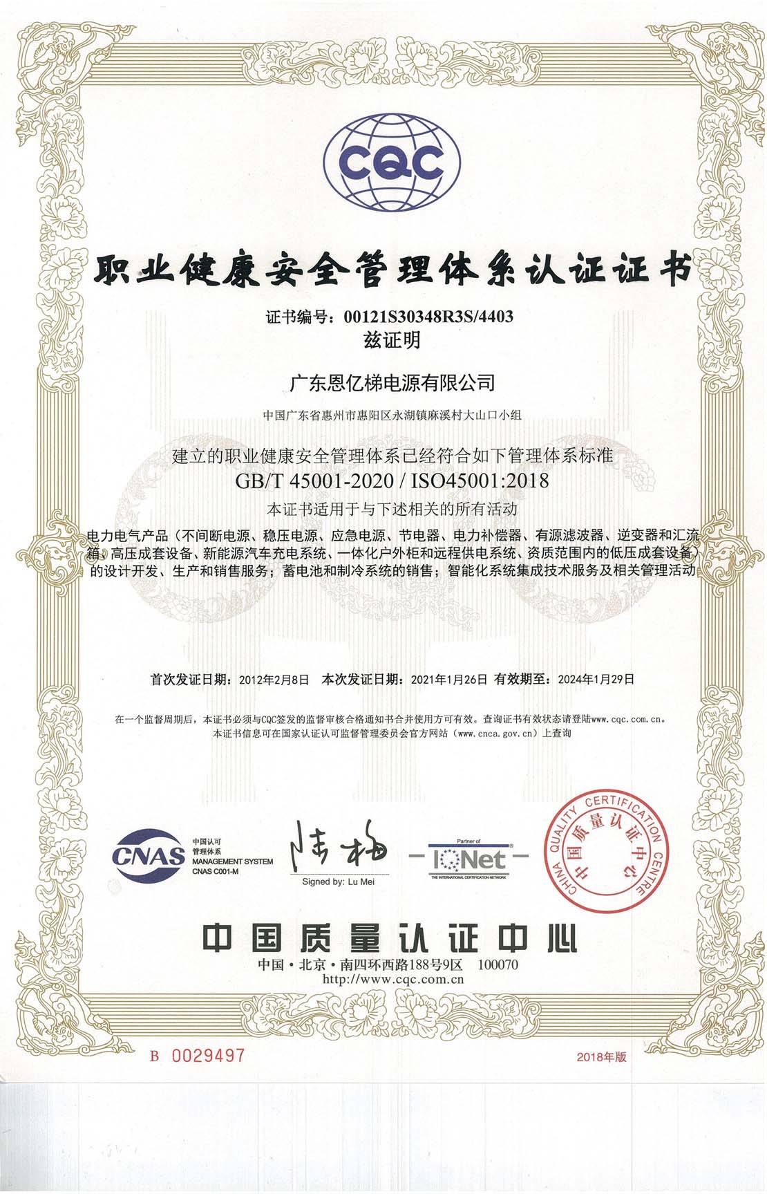 職業健康安全管理體系認證證書