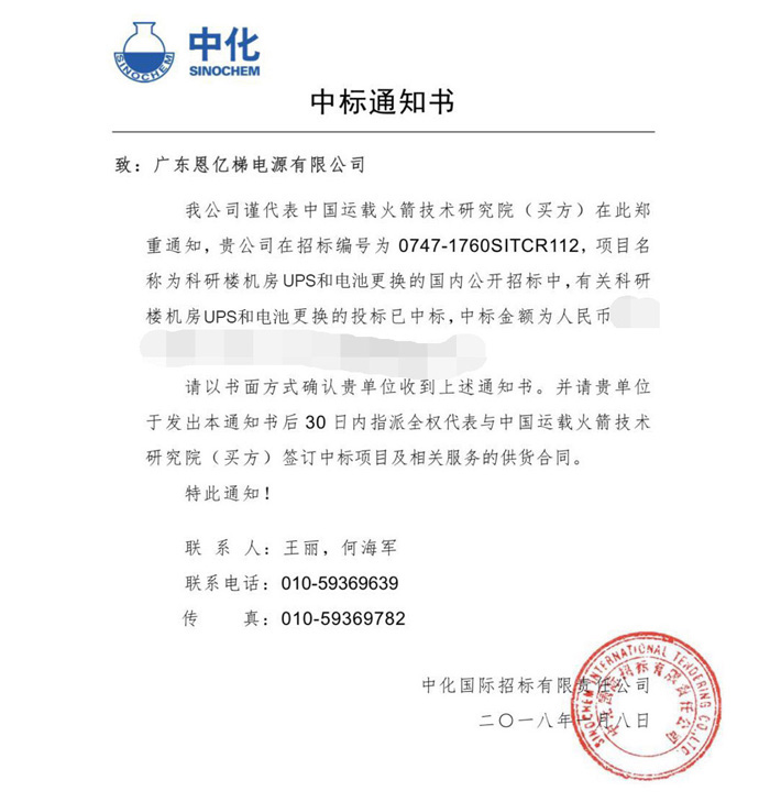 中國運載火箭技術(shù)研究院作為我國首屈一指的國防科研單位,其設(shè)備采購及供應(yīng)商選擇都有著嚴(yán)格的標(biāo)準(zhǔn),不僅要求競標(biāo)企業(yè)提供的產(chǎn)品符合其特定的技術(shù)規(guī)范,還需對競標(biāo)企業(yè)品牌、價格、服務(wù)、信譽等方面進行全方位的評審,經(jīng)過國內(nèi)多家電源廠商的激烈角逐,最終確認(rèn)恩億梯成功中標(biāo),目前公司已收到中標(biāo)通知書。