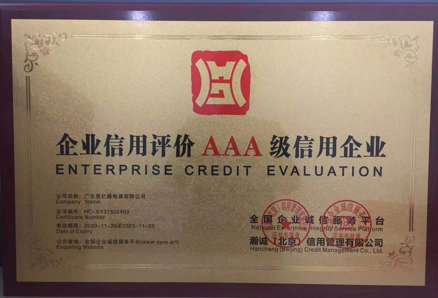企業(yè)信用等級AAA證書